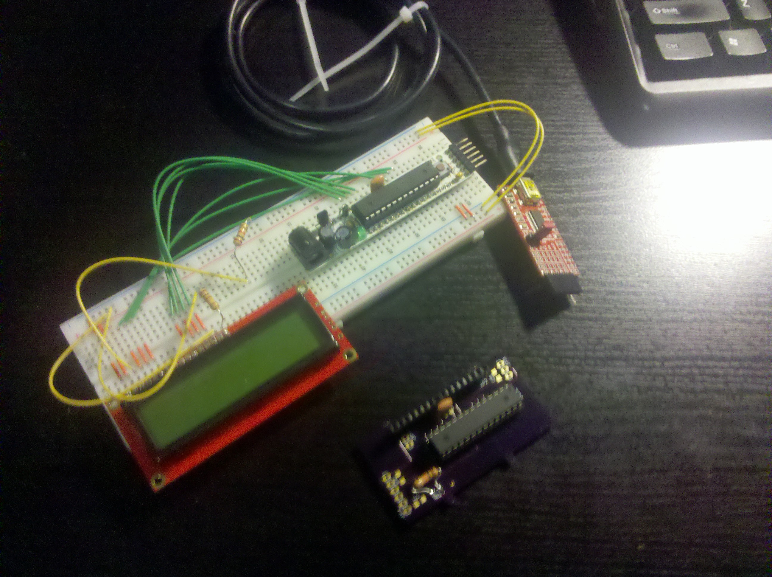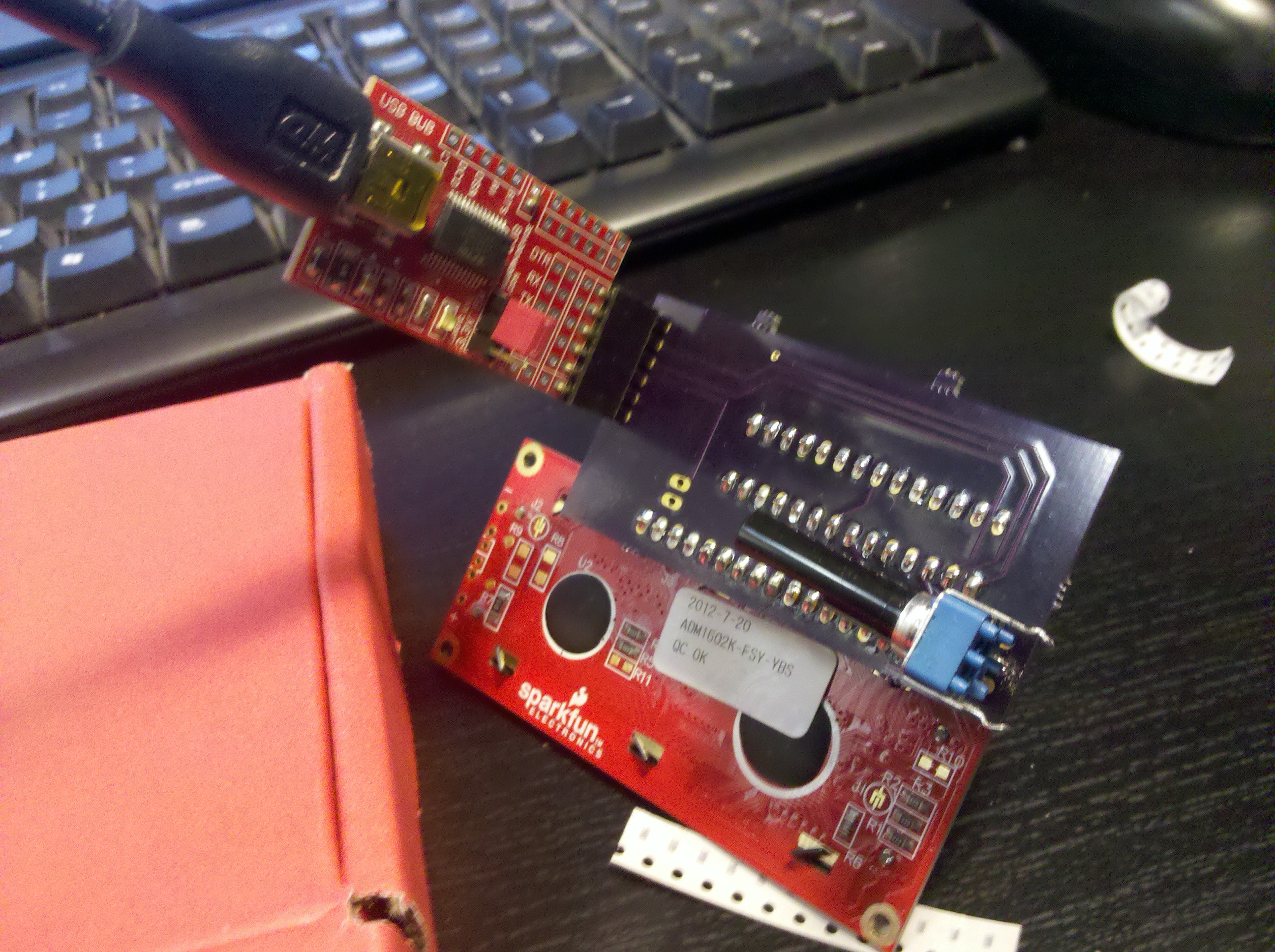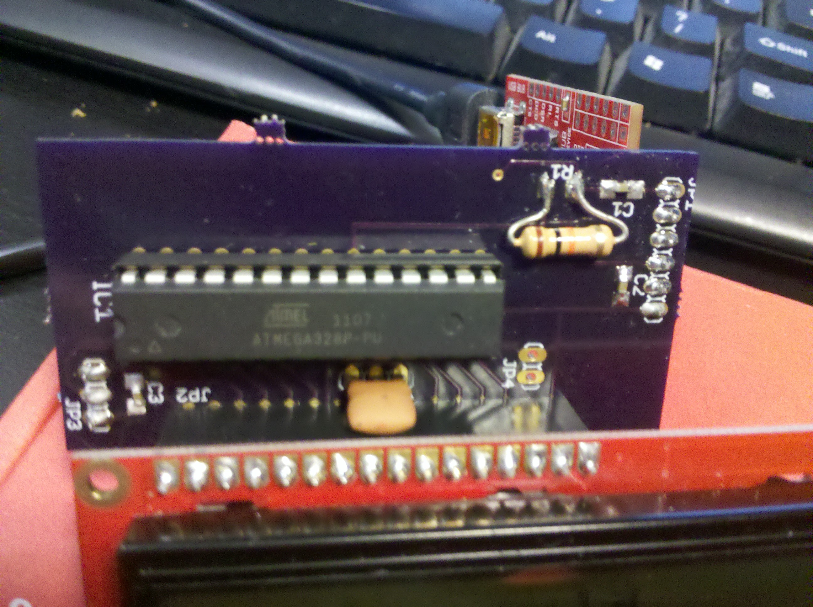 All there is to the board is the atmega, a 16 mhz resonator, a few decoupling capacitors, a potentiometer, and a resistor. I didn't have any smd components when I first started populating the board so I soldered a resistor on pads meant for a 1206 package; I decided to wait until I got some smd parts before hacking the rest of them on this way.