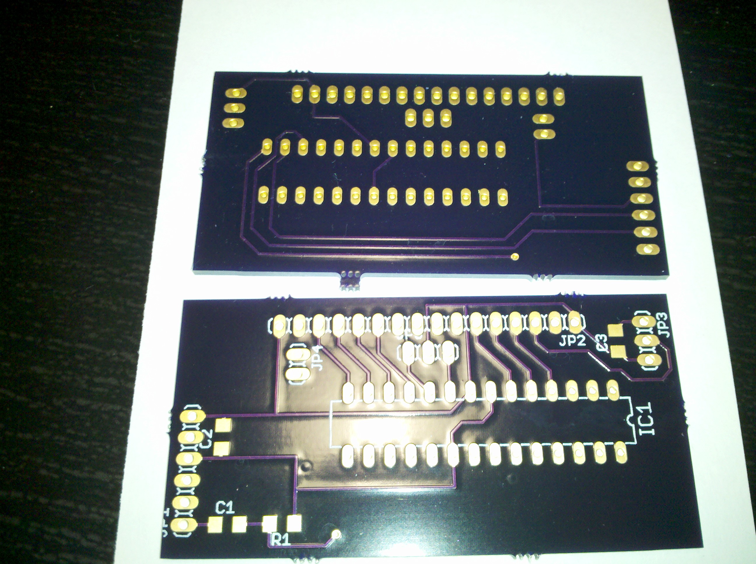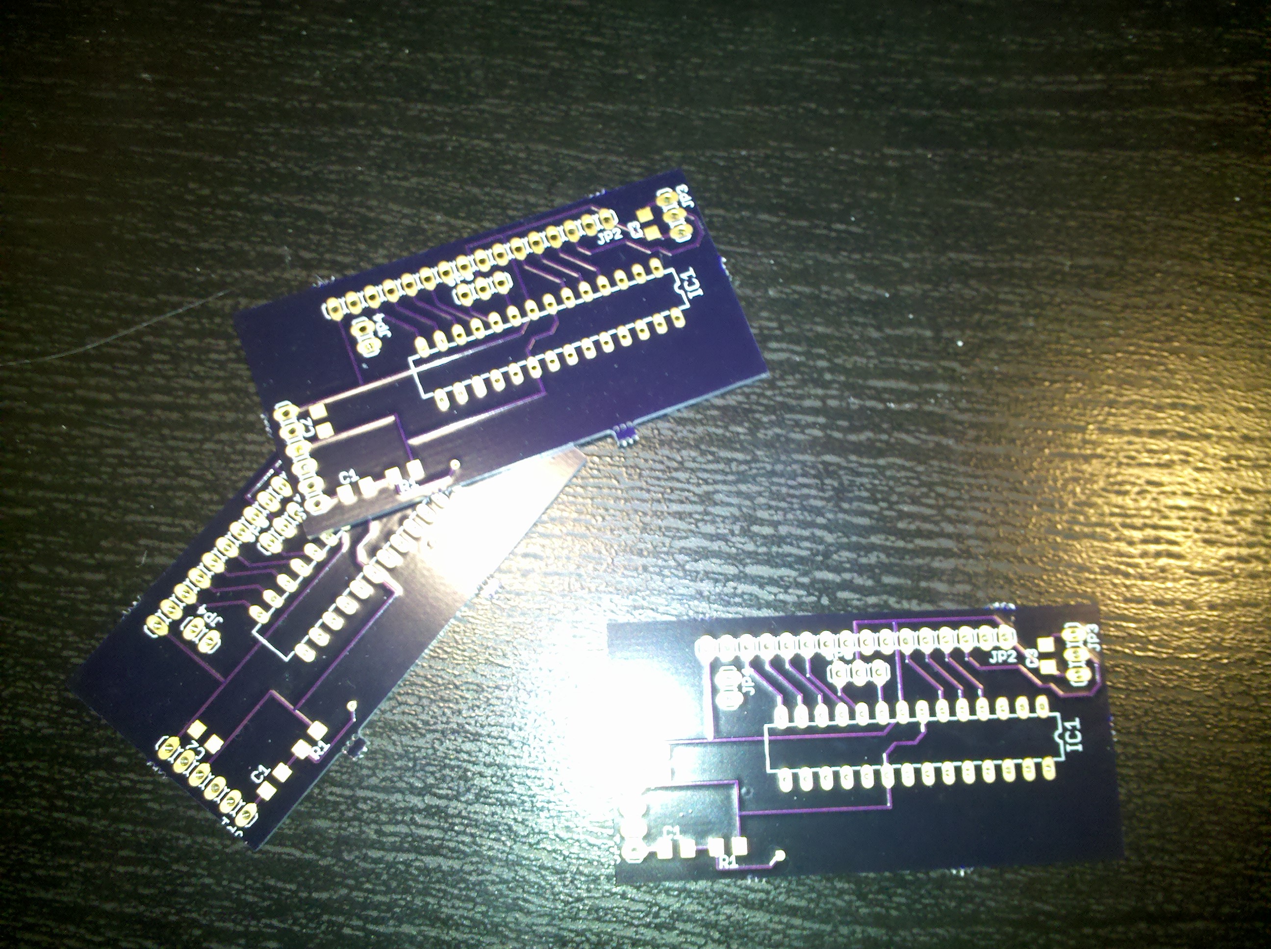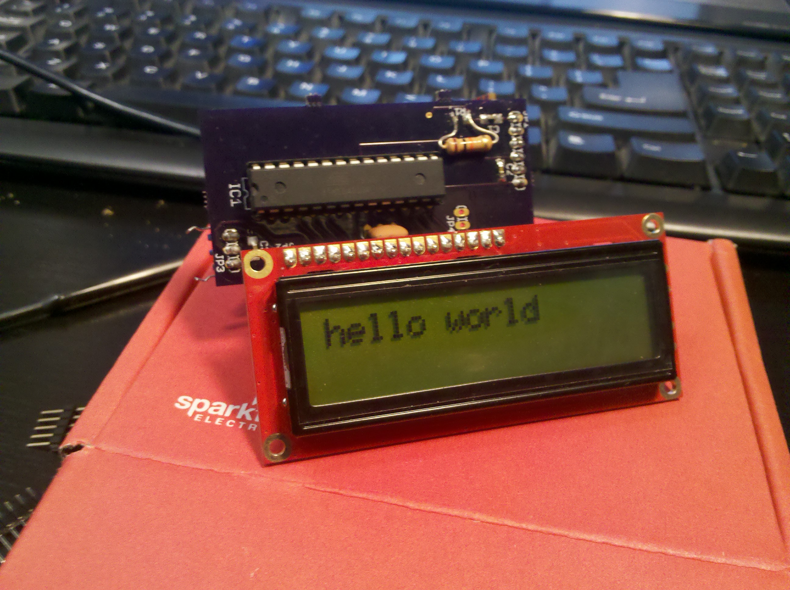 All there is to the board is the atmega, a 16 mhz resonator, a few decoupling capacitors, a potentiometer, and a resistor. I didn't have any smd components when I first started populating the board so I soldered a resistor on pads meant for a 1206 package; I decided to wait until I got some smd parts before hacking the rest of them on this way.