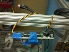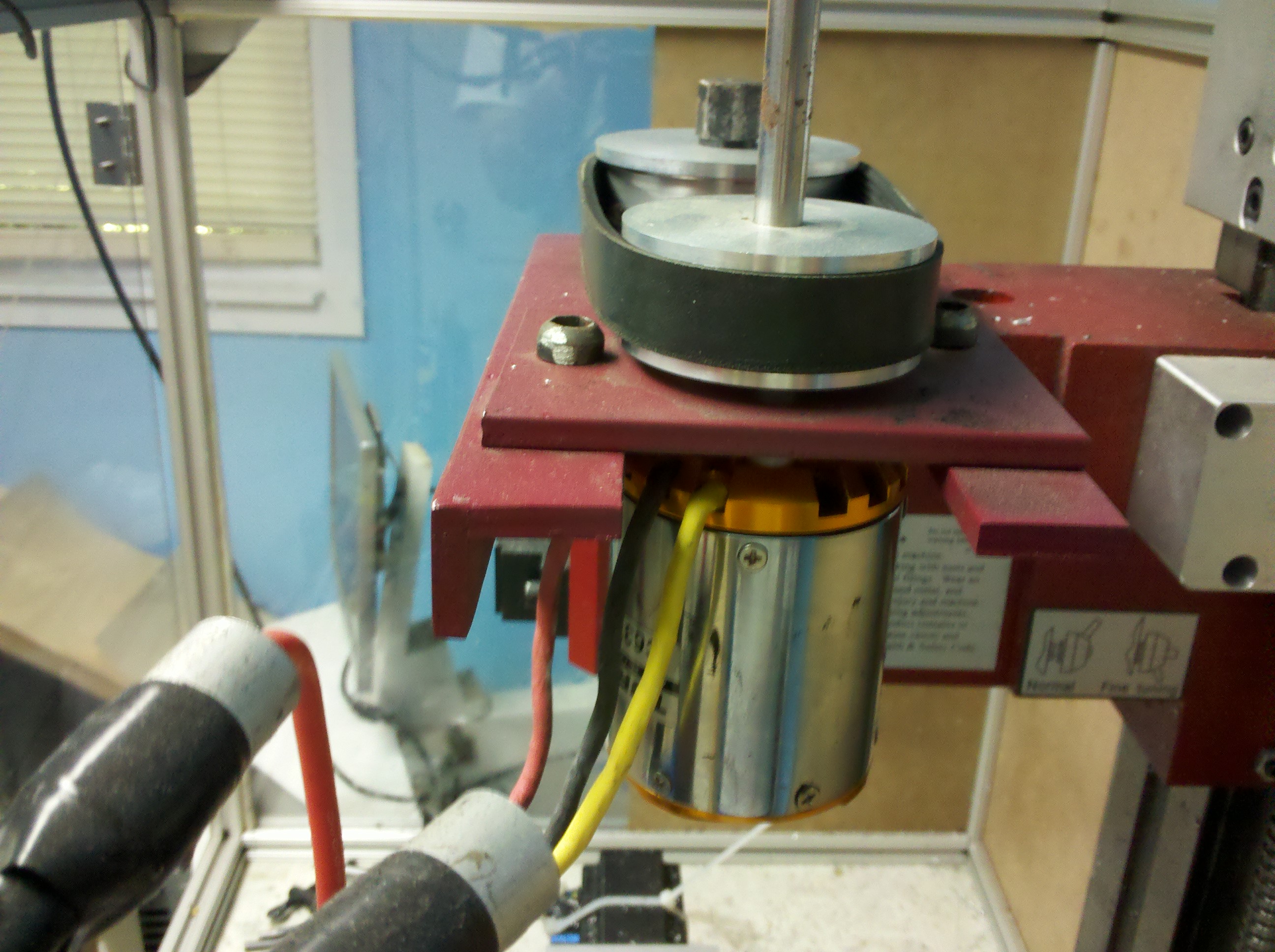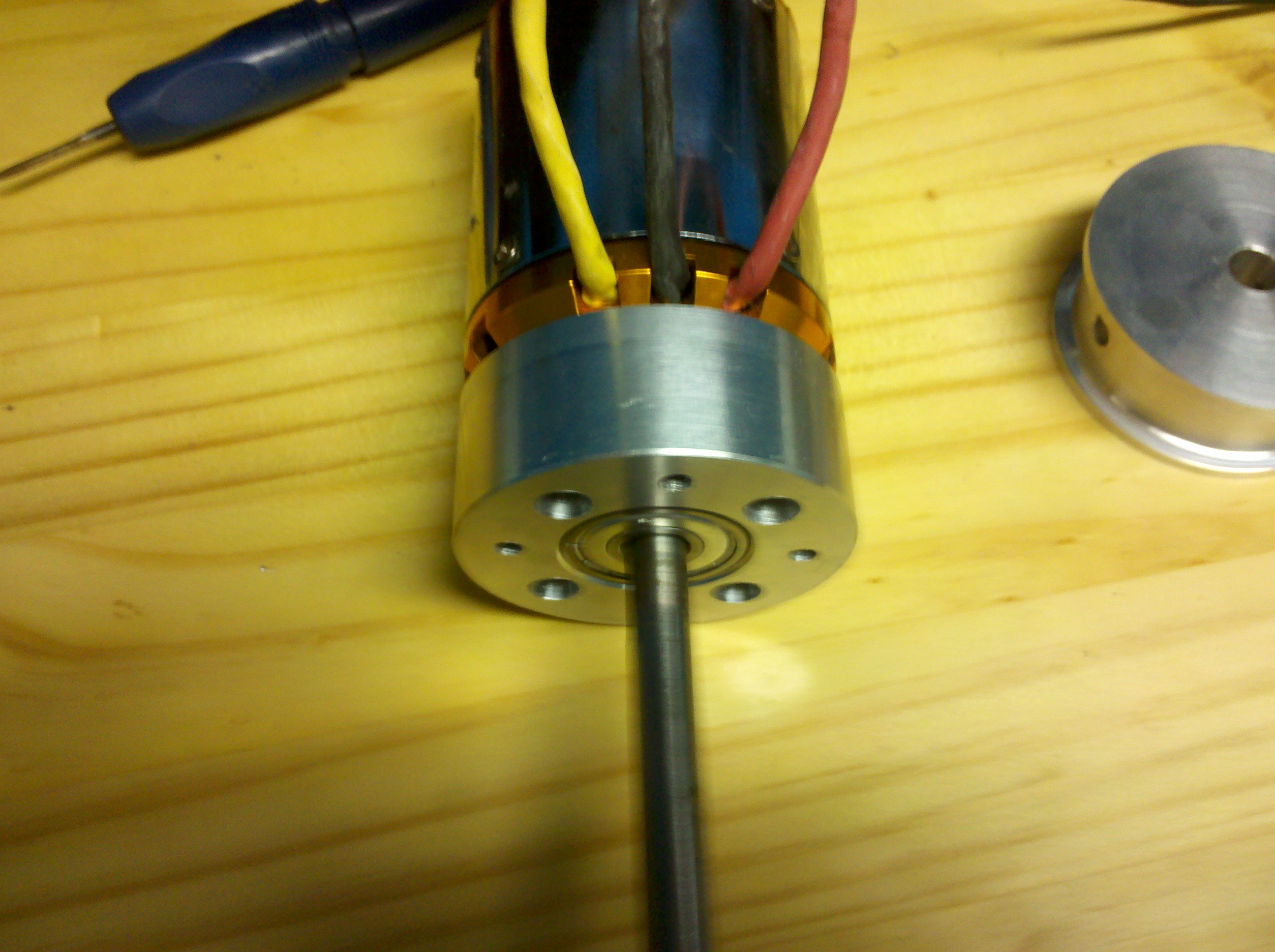 Here is the mount and pulley system I built when I first got the motor. The biggest issue with this setup are the plastic standoffs on the face of the motor. Also the motor is not built to handle the potentially large overhung load from the drive pulley. The first thing I did was replace original motor shaft with a tougher alloy (I forget what). On the rightmost picture you can see the microcontroller that generates the signal required for the brushless motor controller I'm using.