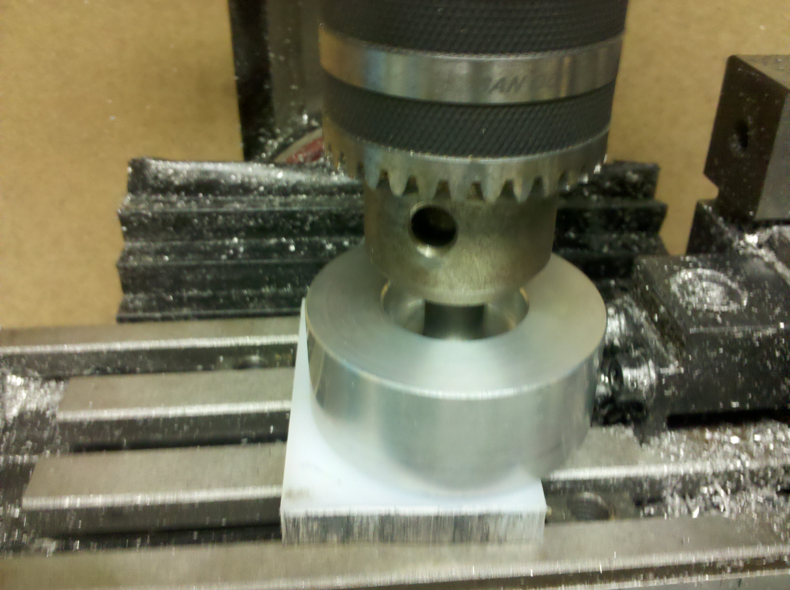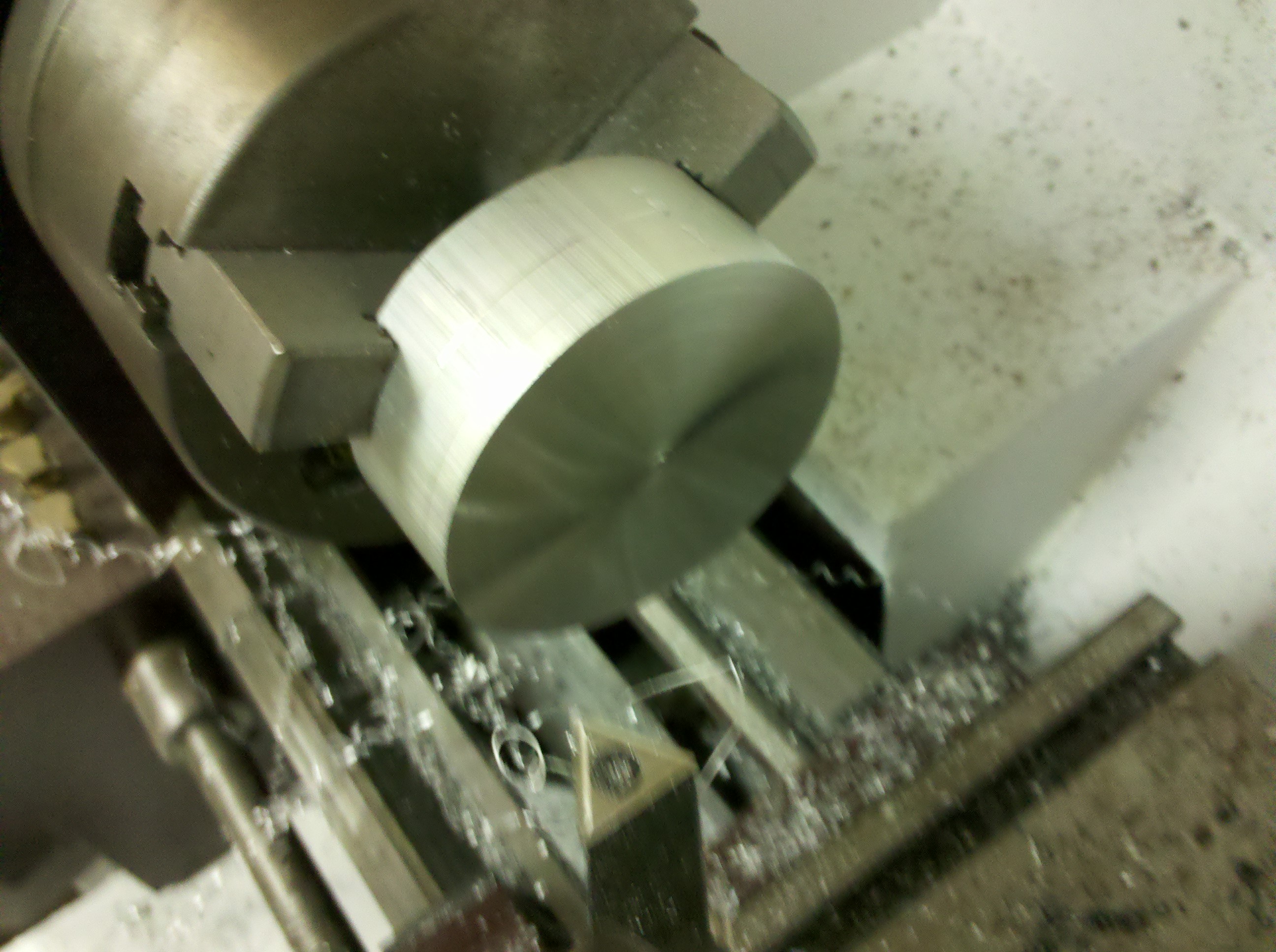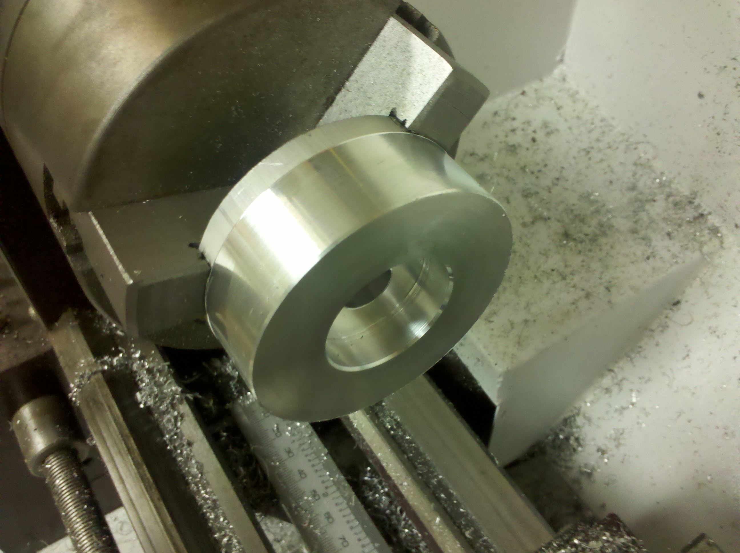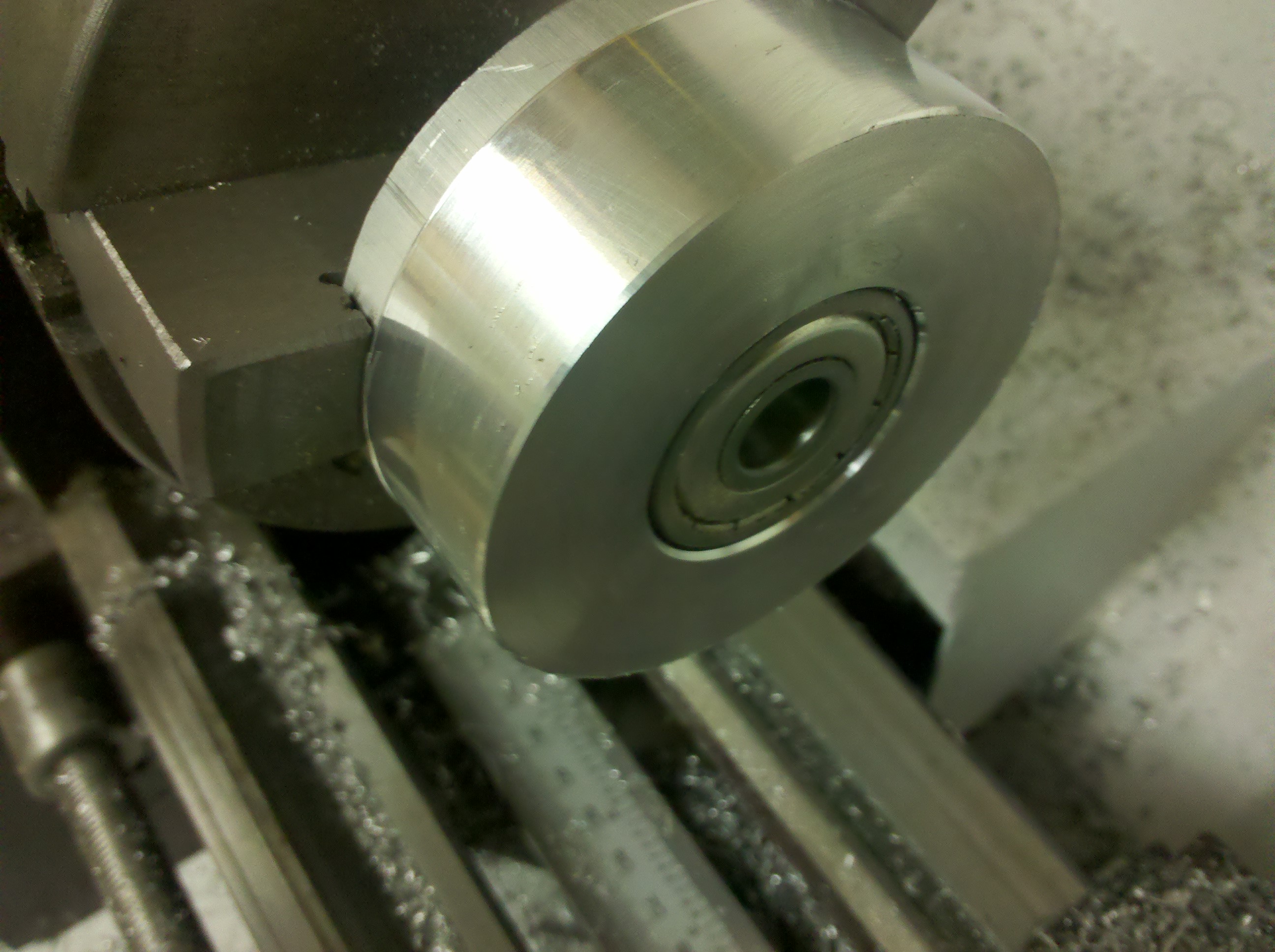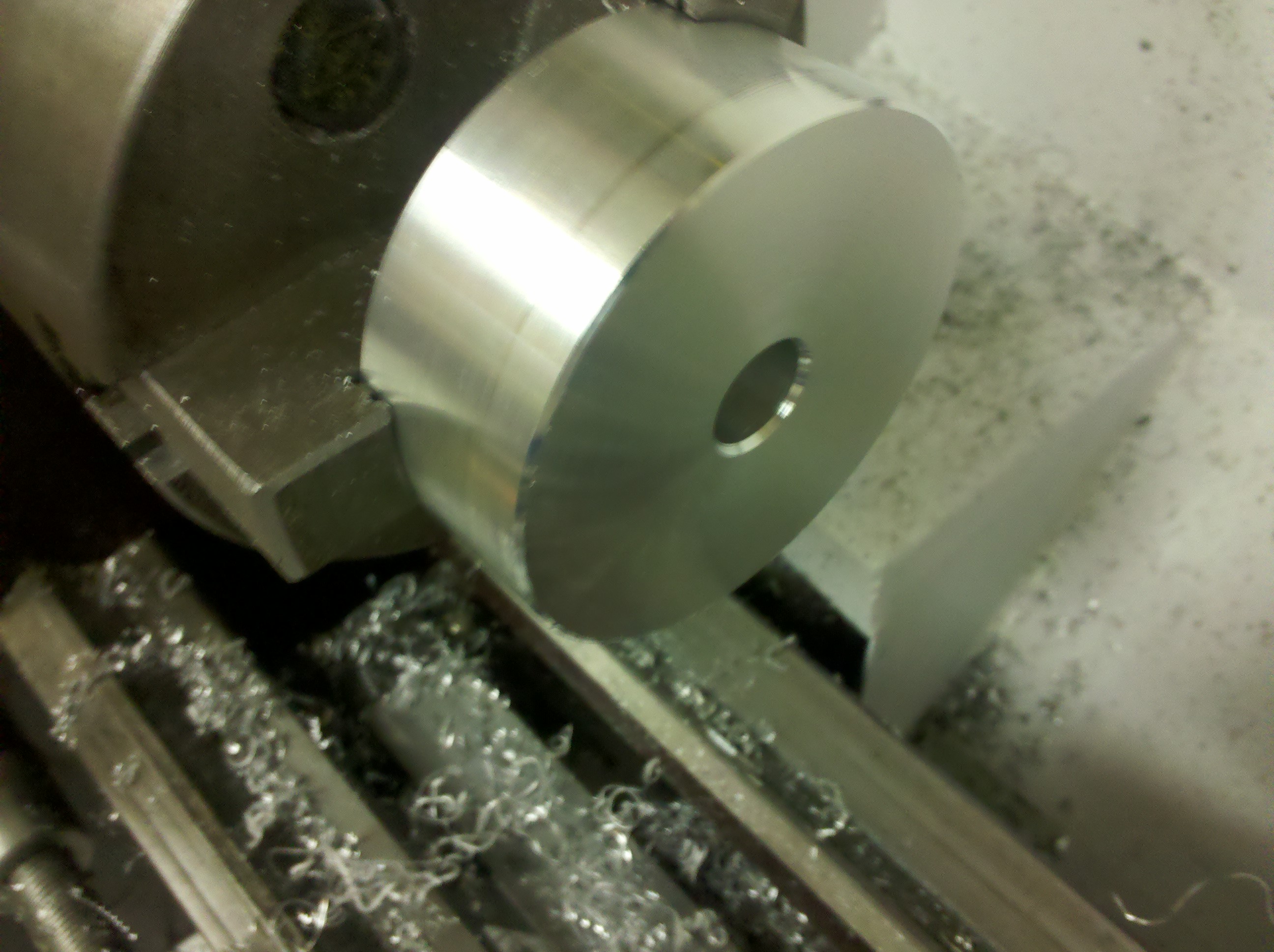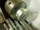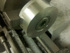 The disk is faced off before a recess is bored to seat the ball bearing. The corners have a .5mm chamfer; the bearing recess is an extra .5mm deep to compensate.